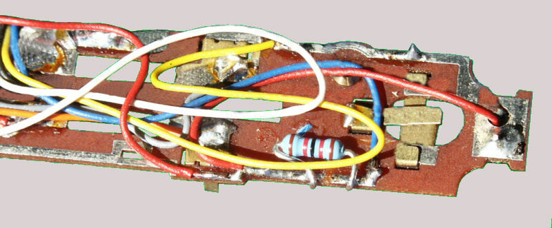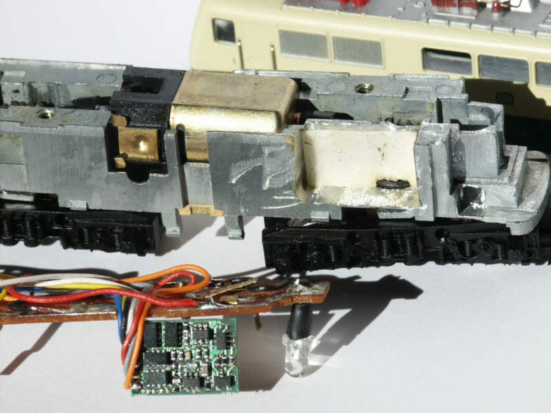 | In manchen Fällen ist es notwendig innerhalb der Lok Platz für den Dekoder zu schaffen. Bei der Lok der Baureihe 111 im Bild unten war dies der Fall. Der Dekoder konnte weder unter dem Metallrahmen, noch oben im Bereich der Stirnseiten untergebracht werden. Die Lokplatine war nicht außreichend zu kürzen, da sonst die Fixierung der Antriebsschnecke nicht mehr gewährleistet war. Die Lösung war dann, eine Aussparung für den Dekoder in den Metallrahmen zu fräsen. Der blanke Ausschnitt wurde zur Isolierung mit einem doppelseitigem Klebeband abgeklebt. Die Lokplatine erhielt eine Einkerbung, damit die Dekoderkabel das eng sitzende Lokgehäuse nicht wegdrücken konnten. Die Lampen der Stirnbeleuchtung wurden durch weiße Leuchtdioden ersetzt. Hier entspricht das Ergebnis noch nicht ganz unseren Erwartungen. Eventuell kann die Leuchtkraft durch Einsatz von anderen Lichtleitern oder Spiegelfolie verbessert werden. Die Leuchtdioden haben einen zu engen Abstrahlwinkel nach oben, der in die Lok eingebaute Plexiglas-Lichtleiter nimmt das Licht aber von der Seite der LEDs ab. |